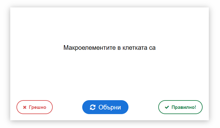 Опитай интерактивните ресурси, за да затвърдиш знанията си по темата „Химичен строеж на клетката“ чрез флаш карти и  упражнения. Така ще учиш по-лесно и ще се подготвиш по-уверено за матурата.
